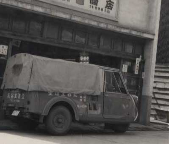 店頭風景。車は、マツダの K360。タイヤが三つしかない三輪車タイプの車です。